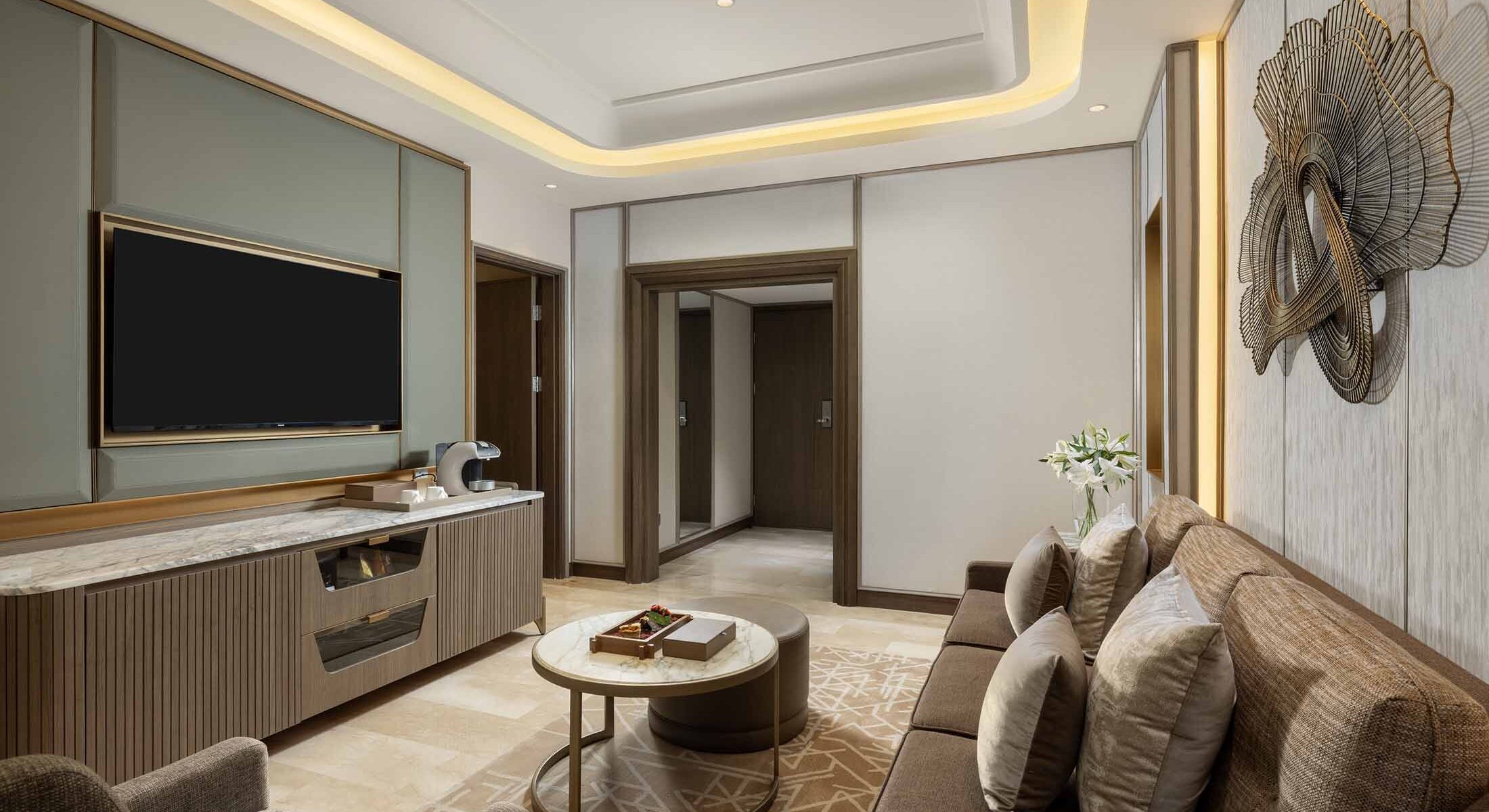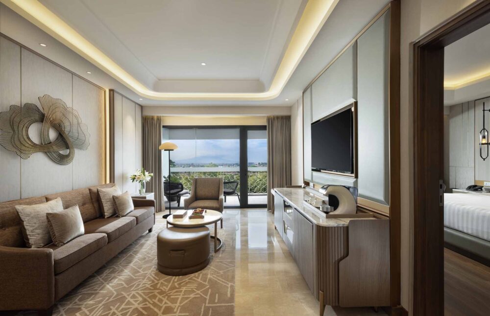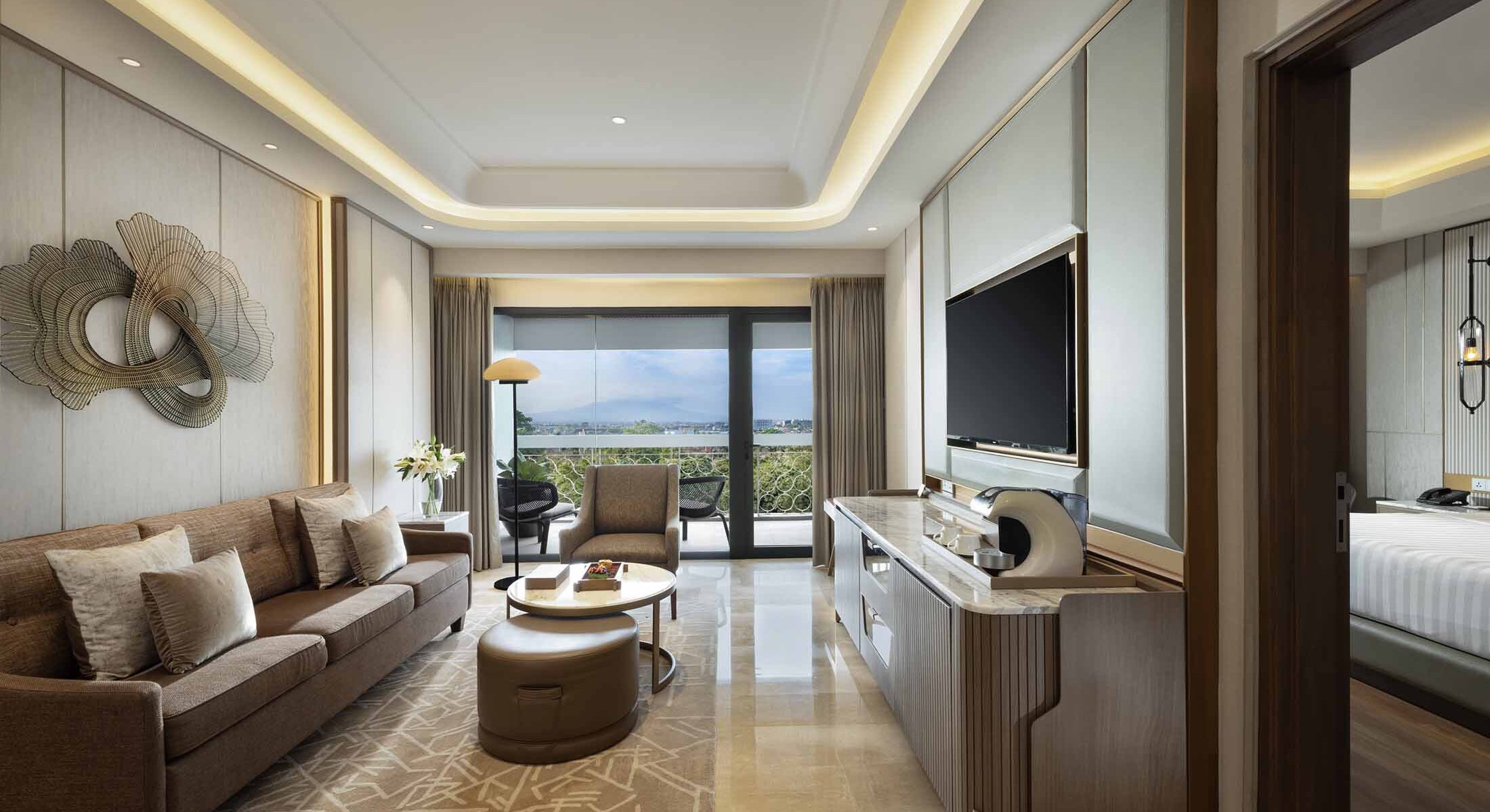 With the size of 80-square-meters, this suite is equipped with a long sofa and balcony with Merapi volcano scenery for the ultimate comfort experience. Comes with the access to the luxurious Royal Club Lounge. Complimentary minibar, bathrobe, wireless internet access, coffee & tea equipment, iron board, in-room hairdryer, hospitality LED TV, laptop-sized in-room safe and premium bedding amenities with pillow-top mattresses is prepared for a quintessential stay.